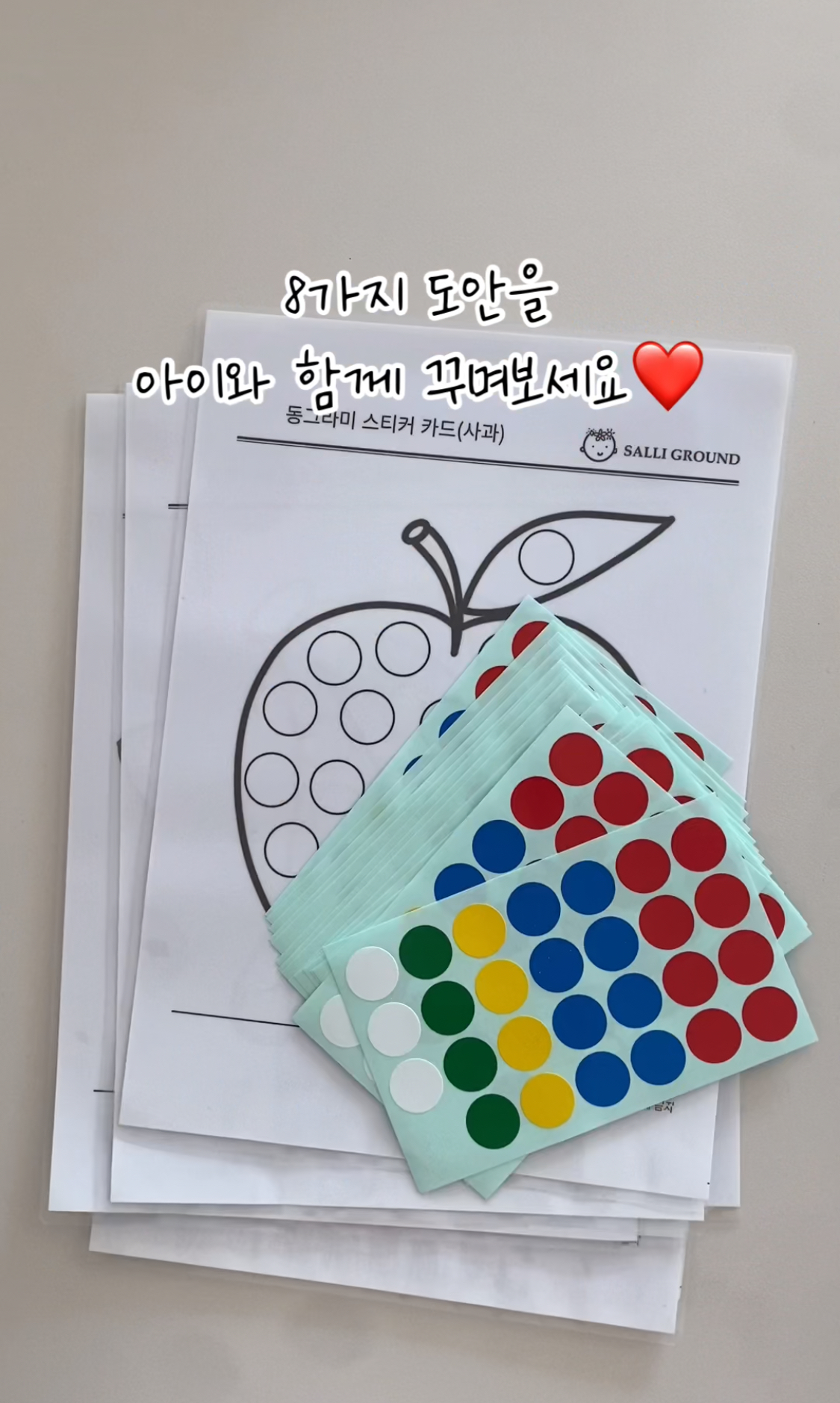 저희 아이와 다이소 스티커로 도안을 완성하는 모습입니다. 스티커가 크고, 그림도 직관적이기 때문에 엄마 찾지 않고 스스로 잘 붙일거예요. 빨강, 파랑, 노랑, 초록, 하양색을 아이가 적절히 섞어서 사용할 수 있도록 도와주세요. 미적 감각도 높일 수 있답니다. 사과, 바나나, 별, 토끼, 무당벌레, 나비, 물고기 등의 아이들이 좋아하는 그림의 도안입니다. 아이들이 정말 좋아하겠죠?