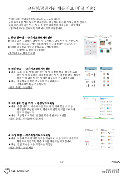 교육청/공공기관에서 제공하는 한글 배우기에 도움되는 워크지를 pdf파일 2장에 정리했어요. 사이트 링크도 첨부되어 있어서 다운 받으시고 클릭만 하면 됩니다.