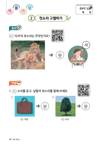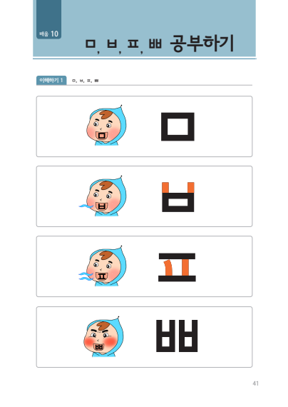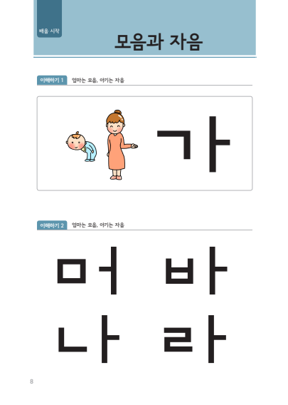 단계 목표 학습 방법 ● 1단계: 한글의 구조 이해, 자음과 모음 익히기 한글이 어떤 원리로 구성되는지 이해하고, 자음14자, 모음10자를 익힘 ● 자음과 모음 카드를 활용해 소리와 모양을 함께 익히기