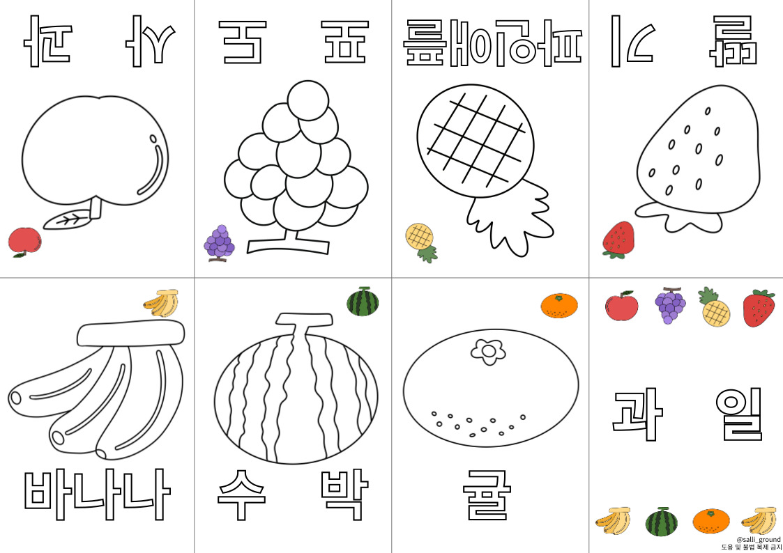 아이들이 좋아하는 과일과 동물로 구성된 A4용지 동물책, 과일책 파일을 다운받으세요.